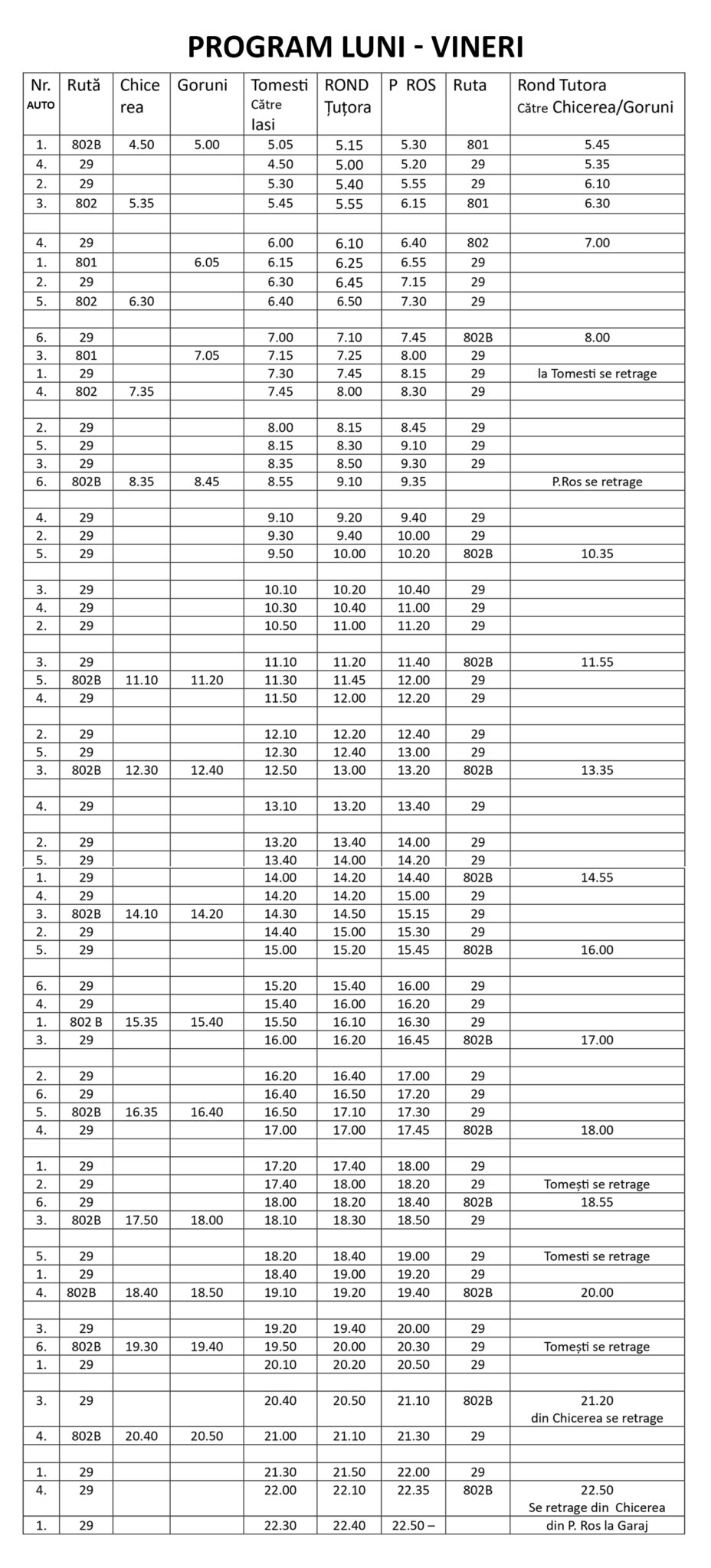 802 Rond Tutora – Tomesti – Chicerea Orare Începând de la ora 7:30 cursele vor fi operate prin Goruni. Deoarece traseele 801,802,802B au fost prelungite până în Podu Roș, stația Rond Țuțora devine simplă stație de tranzit. Din acest motiv, orele de sosire, în această stație, sunt estimative.